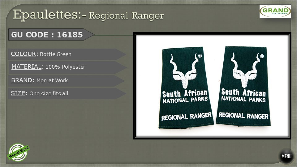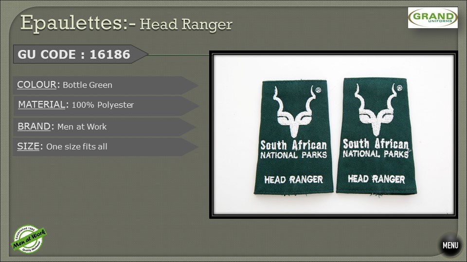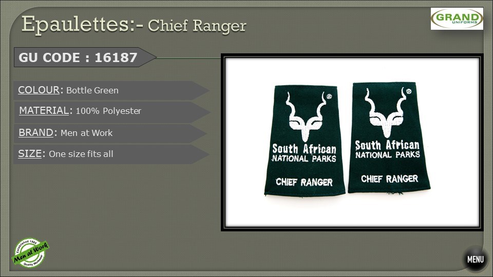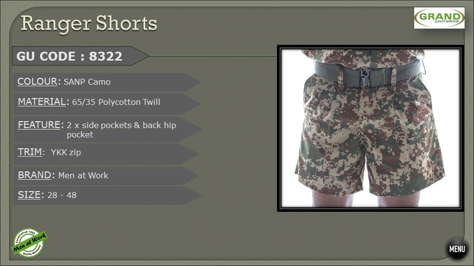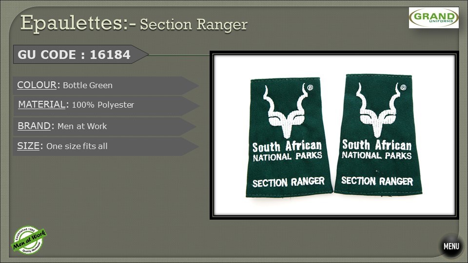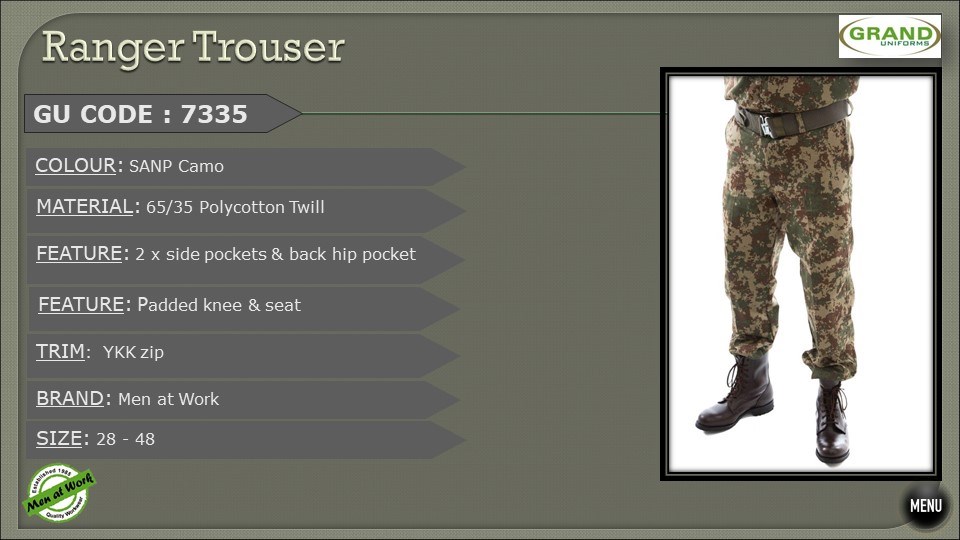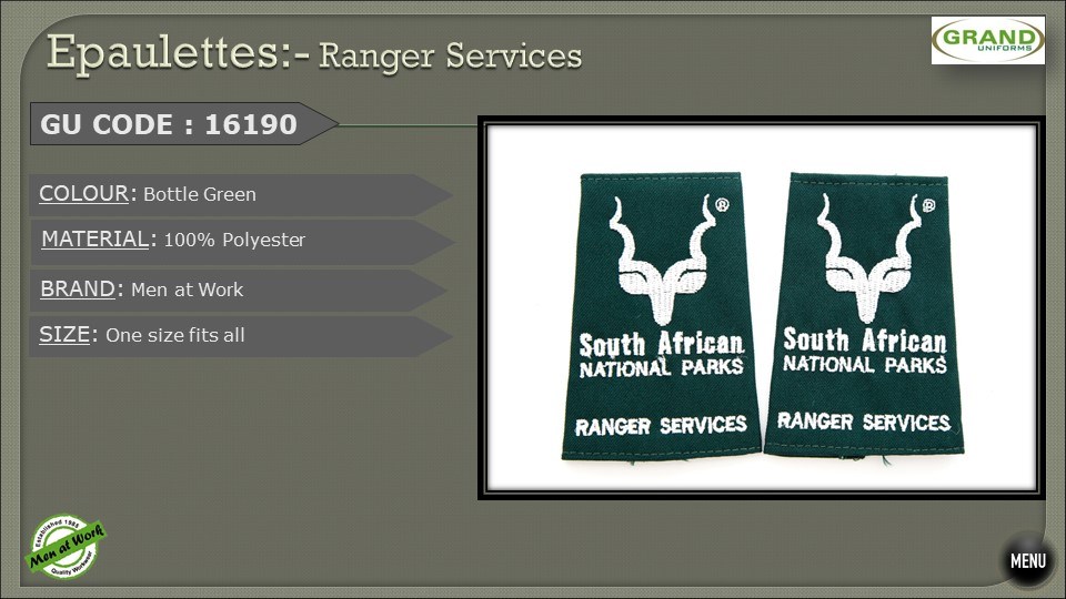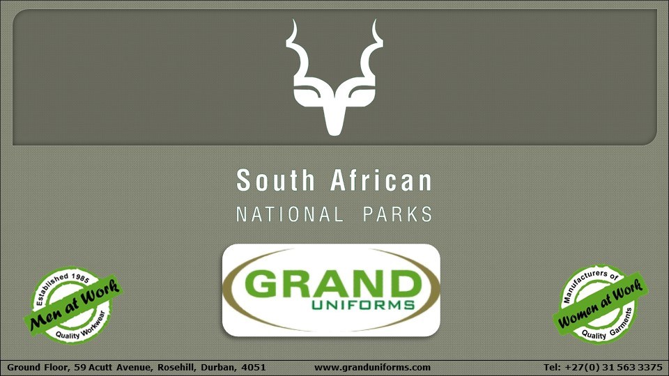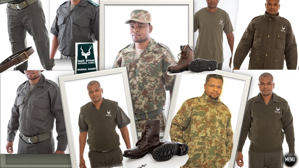 Listed here is the full range of South African National Parks Ranger Uniforms & Footwear products. These Men at Work items are proudly manufactured by Grand Uniforms at our Durban based factory and are for the sole use of SANParks Rangers and Anti-Poaching Units.