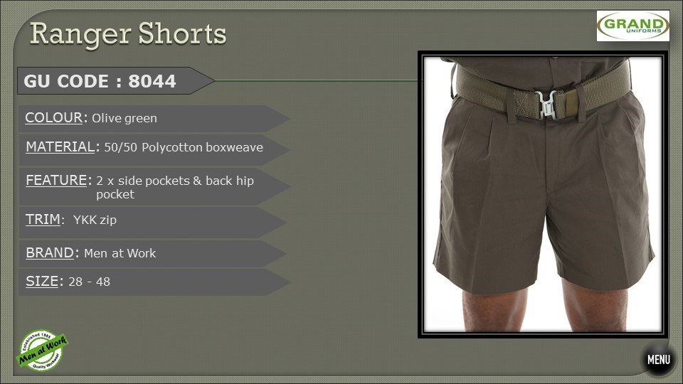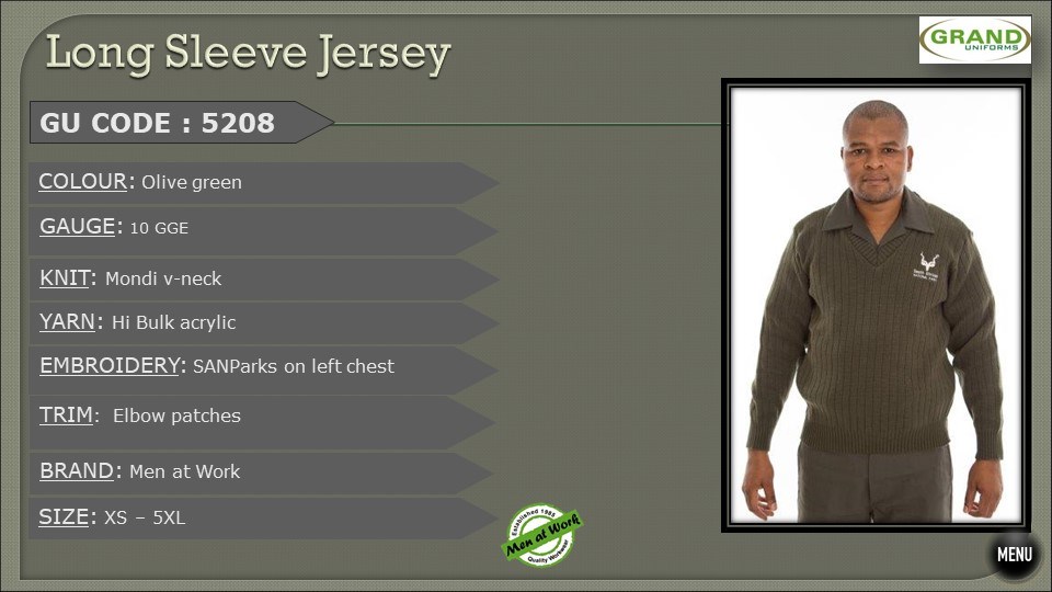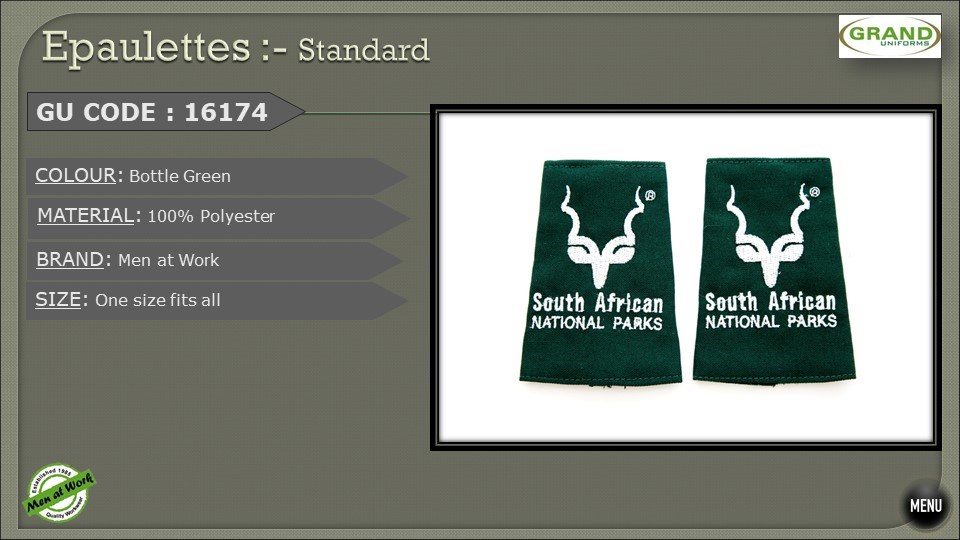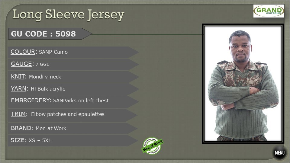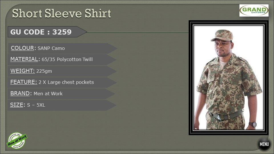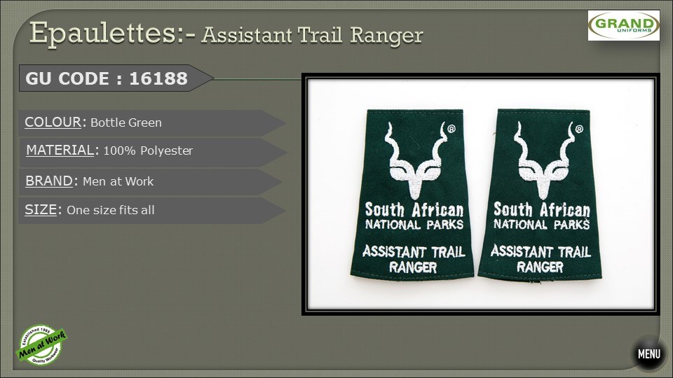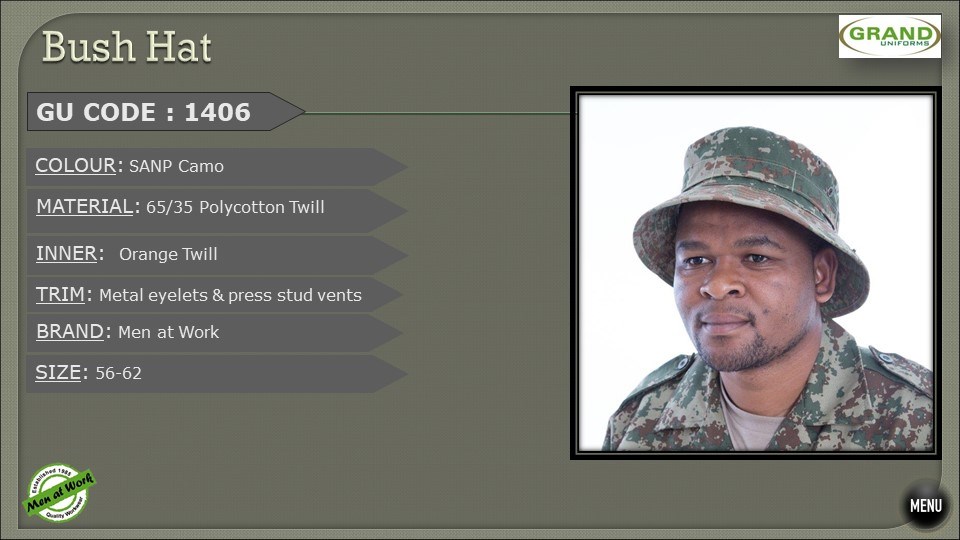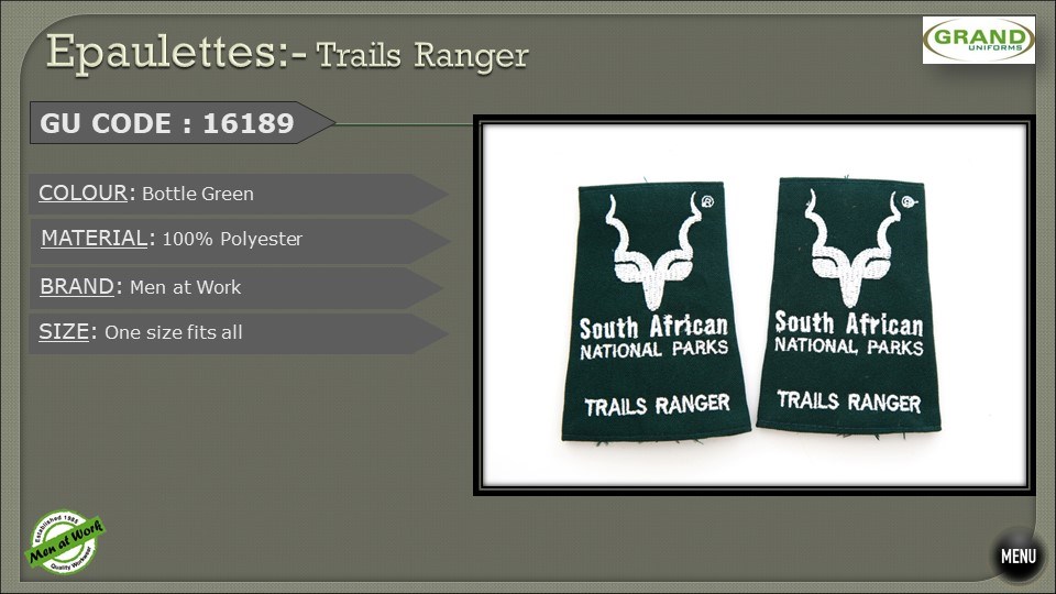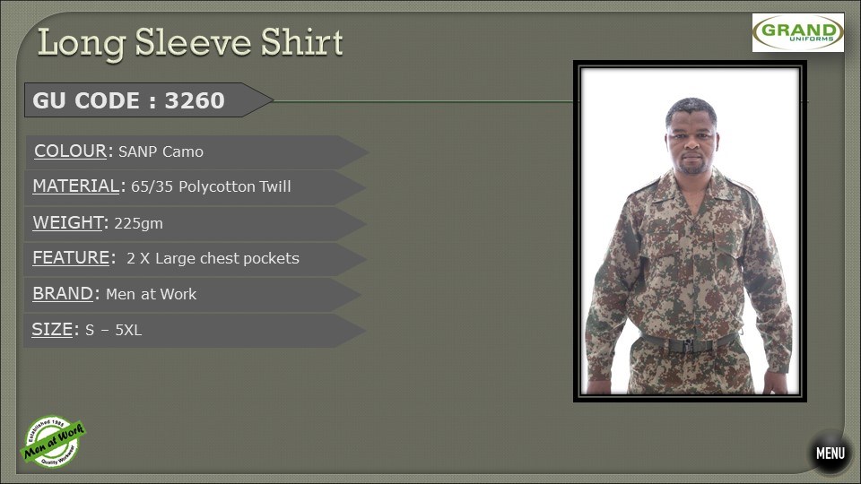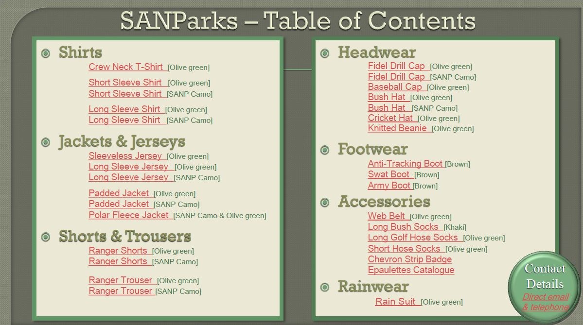 Listed here is the full range of South African National Parks Ranger Uniforms & Footwear products. These Men at Work items are proudly manufactured by Grand Uniforms at our Durban based factory and are for the sole use of SANParks Rangers and Anti-Poaching Units.