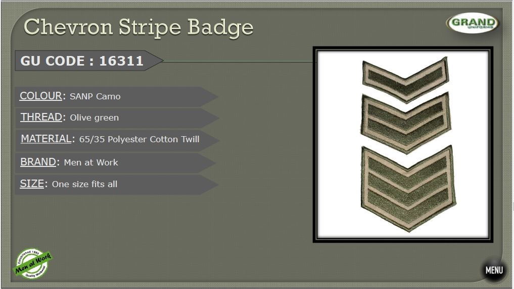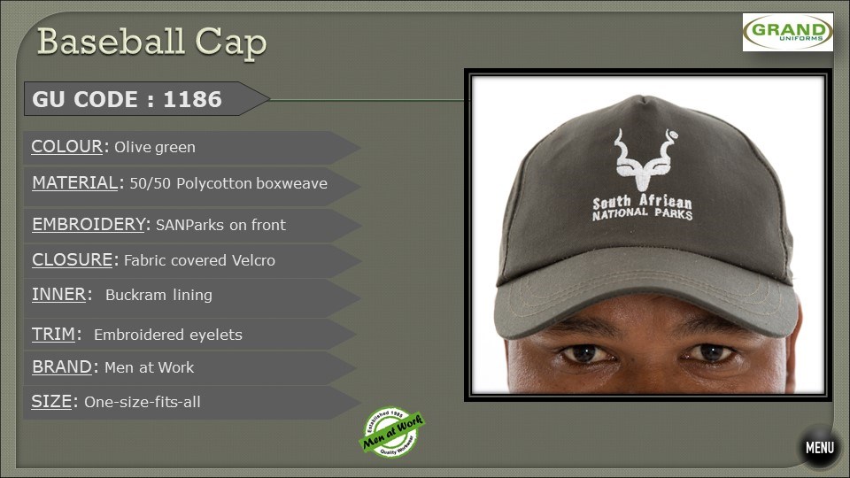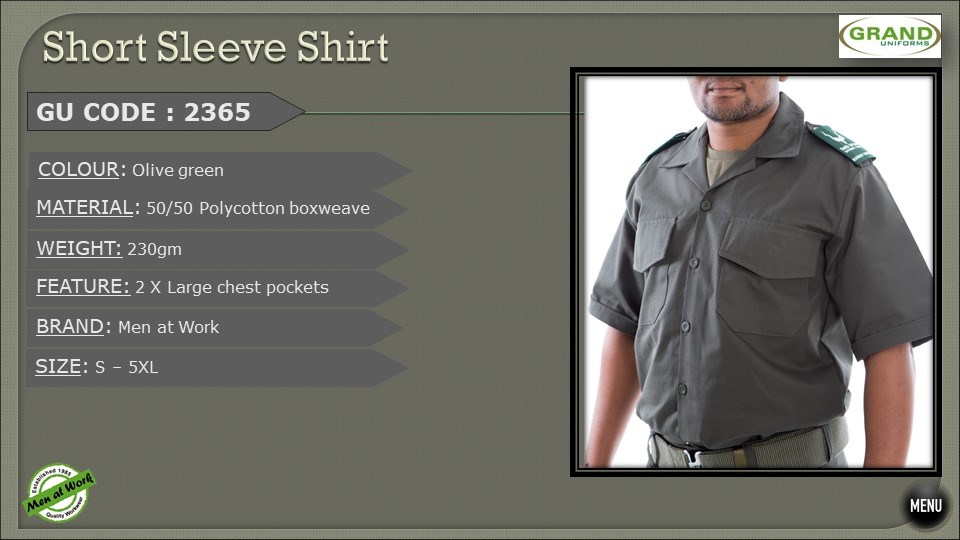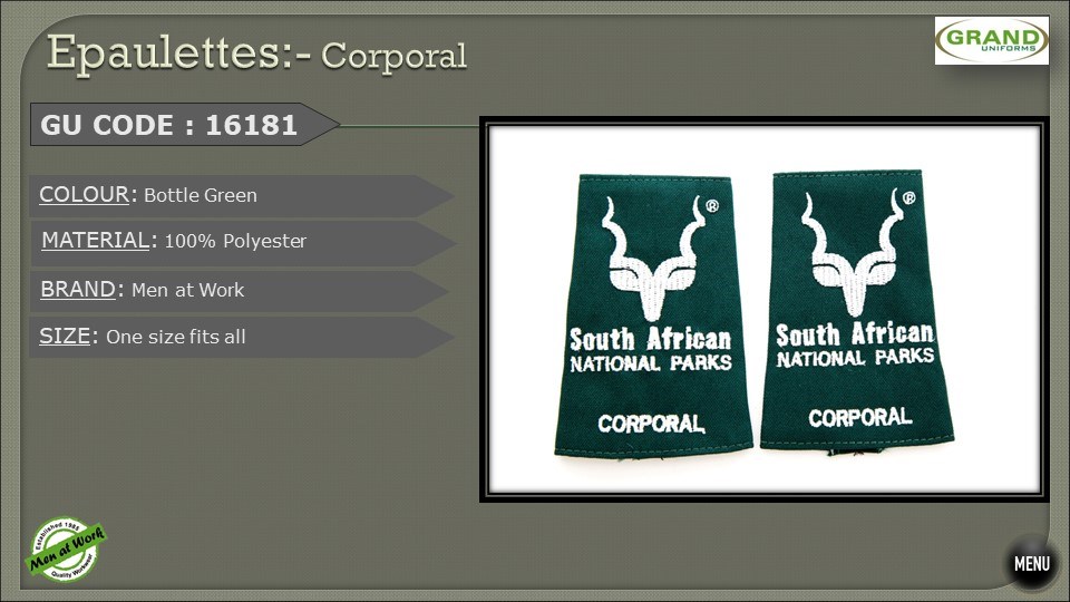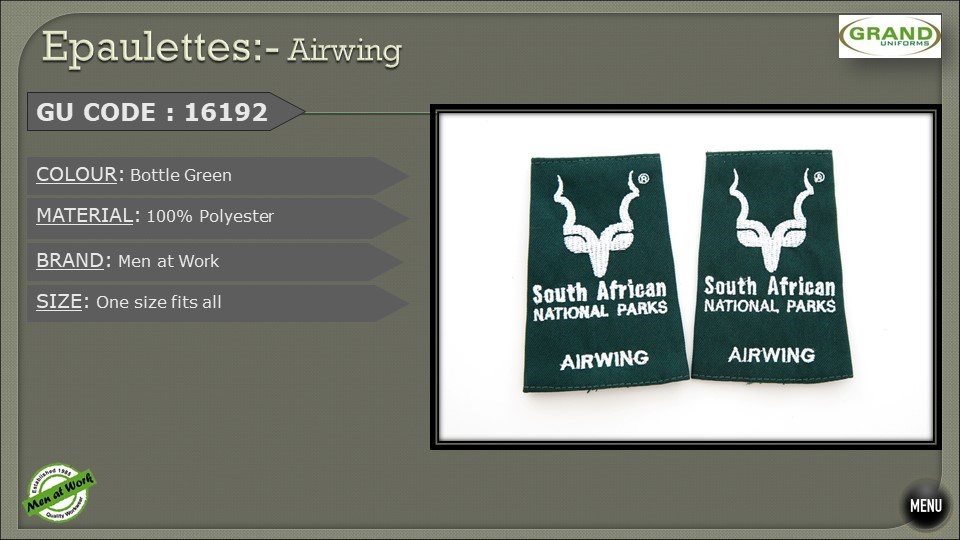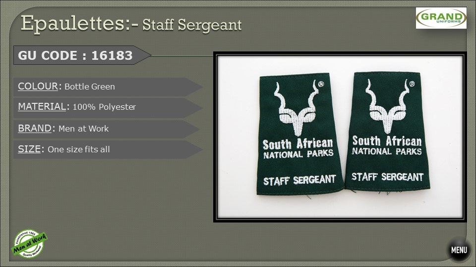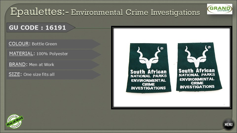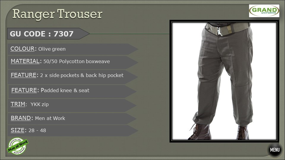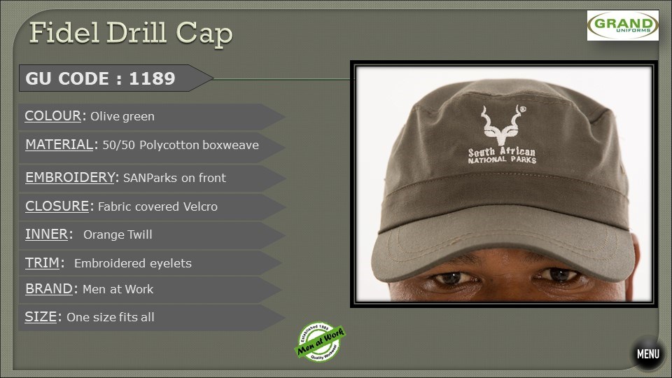 Listed here is the full range of South African National Parks Ranger Uniforms & Footwear products. These Men at Work items are proudly manufactured by Grand Uniforms at our Durban based factory and are for the sole use of SANParks Rangers and Anti-Poaching Units.