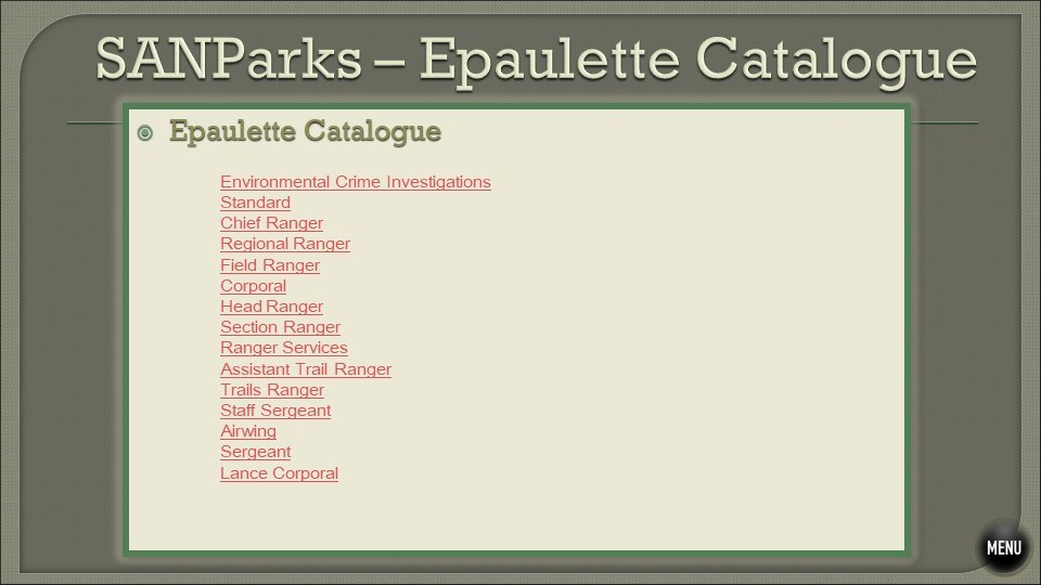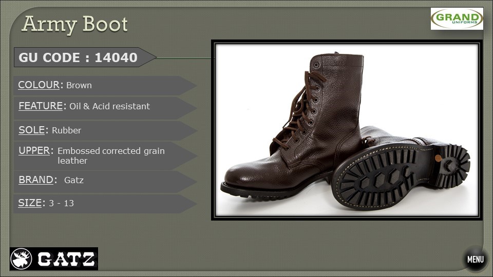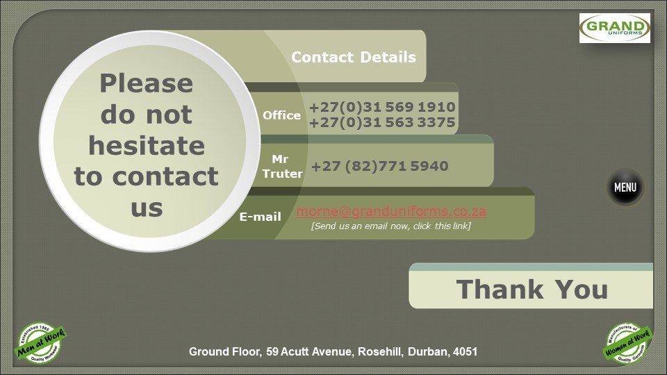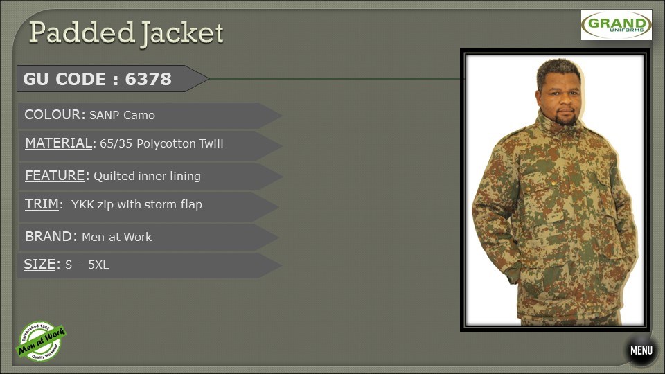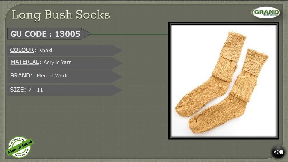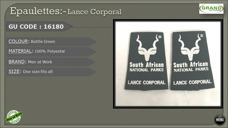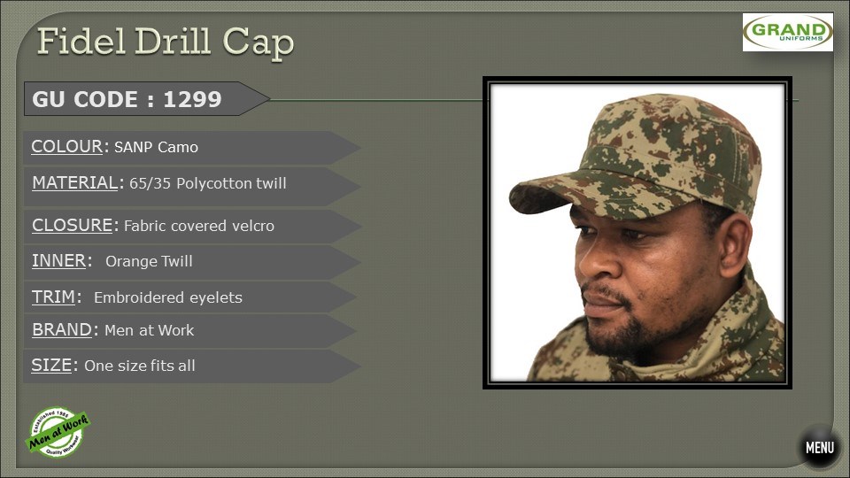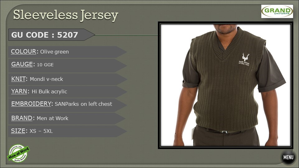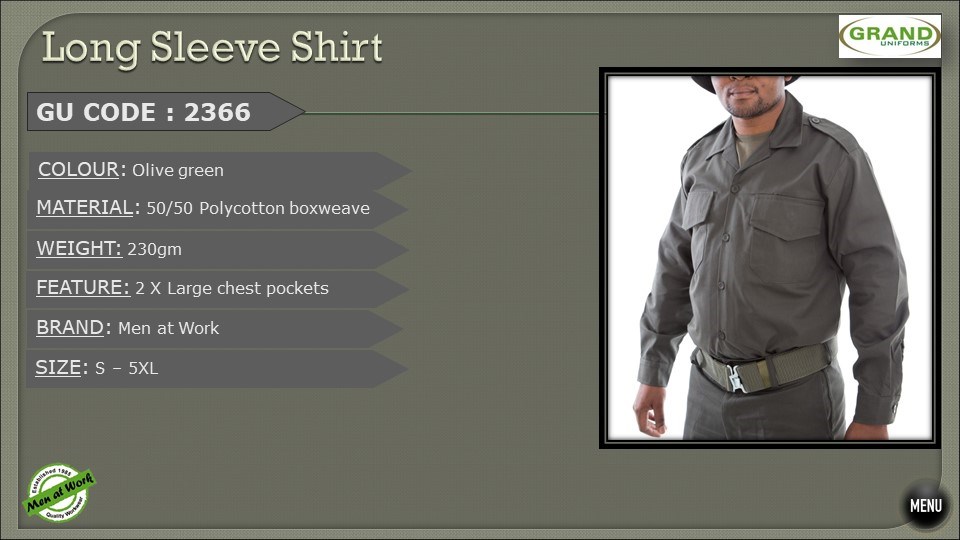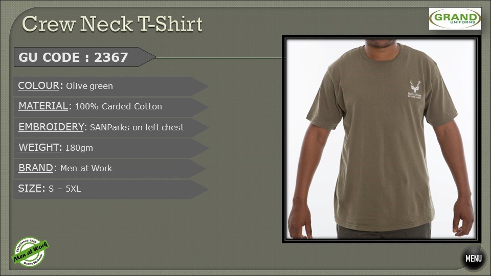 Listed here is the full range of South African National Parks Ranger Uniforms & Footwear products. These Men at Work items are proudly manufactured by Grand Uniforms at our Durban based factory and are for the sole use of SANParks Rangers and Anti-Poaching Units.